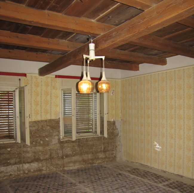 Annyi változás történt, hogy a már említett előtér és a szoba közötti falat kinyitottam. Itt a statikára figyelni kellett, mert ez egy tartófal volt, ezen pihentek két irányból a mestergerendák. Az állékonyságot egy belső gerendázat beépítésével biztosítottam. Így a belső térben - a szerkezet kulisszáiba is betekintést engedve - rusztikus látványt nyújt a két kilátszó mestergerenda vége. Ezt a teret fogom majd középen egy fatüzelésű kandallóval ( kandallóbetétes, légfűtésű típussal) optikailag kettéválasztani. Az eredeti konyhából egy kis szobát tudtam csinálni, a kamrából pedig apró fürdőszoba lett, zuhanyzóval, vízmelegítővel, mosdóval, mosógéppel.